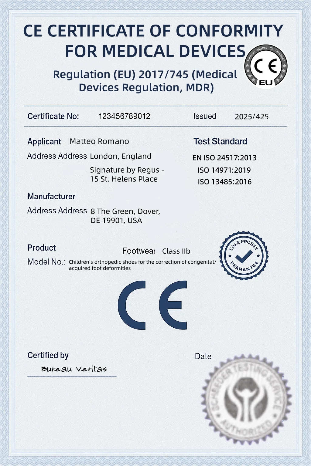 Abbiamo ottenuto la certificazione ai sensi del Regolamento UE (UE) 2017/745 e ci atteniamo rigorosamente alle tre norme principali che regolano i test specialistici per le calzature ortopediche pediatriche: EN ISO 24517:2013 (Requisiti generali per i dispositivi ortopedici) ISO 14971:2019 (Gestione dei rischi per i dispositivi medici) ISO 13485:2016 (Sistemi di gestione della qualità) I nostri prodotti sono stati inoltre riconosciuti e certificati da Bureau Veritas, uno degli enti di certificazione più rispettati al mondo. Dalla selezione delle materie prime al processo di produzione, ogni anello della catena è sottoposto a severi controlli!